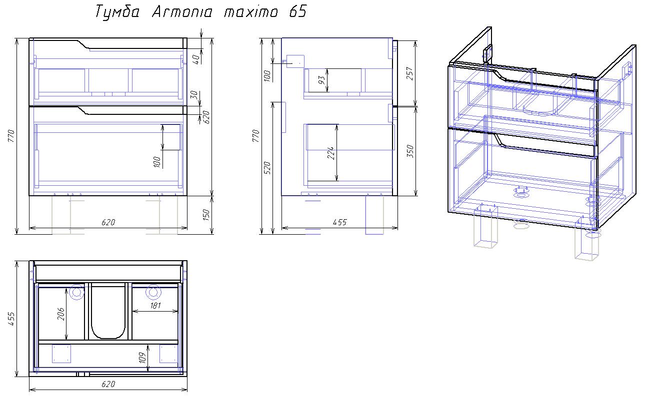Тумба с двумя выдвижными ящиками с отсеками. Ящики оснащены системой доведения для тихого и плавного закрывания.