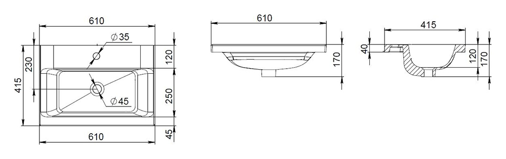 нижнее: выдвижной ящик, один отсек.