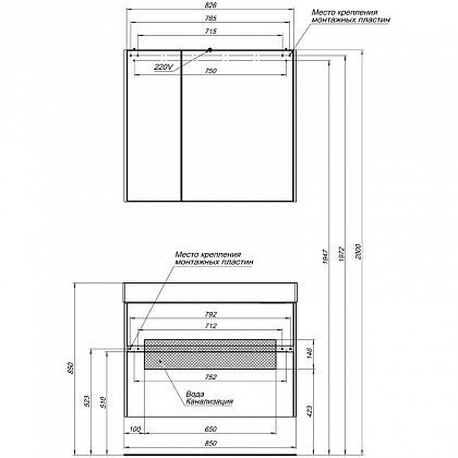 У тумбы два выдвижных ящика: нижний для более крупных предметов и верхний с отделениями для аксессуаров и ванных принадлежностей.