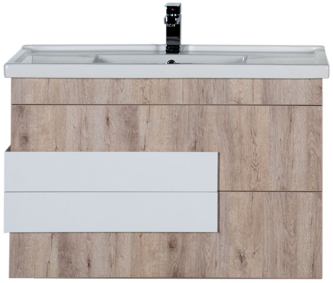 Подвесная тумба под раковину Aquanet Мадейра 100 183072 с двумя выдвижными ящиками, с фактурной отделкой под натуральное дерево оттенка дуб кантри и с широкими белыми глянцевыми ручками. Благодаря механизму доводчиков ящики закрываются бесшумно и легко. Вместительная тумба обеспечивает комфортное размещение и хранение принадлежностей. Предназначена для использования в ванных комнатах с повышенной влажностью. Соответствует стандартам безопасности.