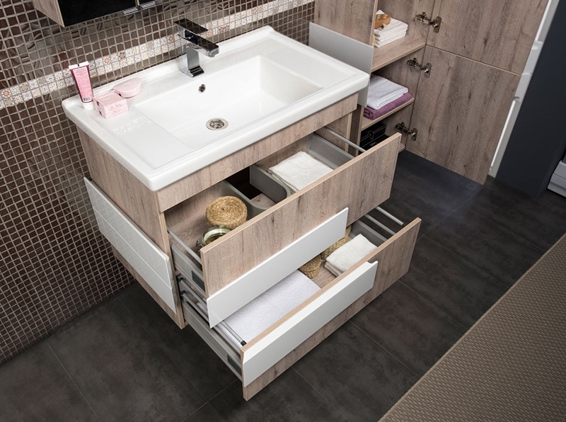 Подвесная тумба под раковину Aquanet Мадейра 80 183071 с двумя выдвижными ящиками, с фактурной отделкой под натуральное дерево оттенка дуб кантри и с широкими белыми глянцевыми ручками. Благодаря механизму доводчиков ящики закрываются бесшумно и легко. Вместительная тумба обеспечивает комфортное размещение и хранение принадлежностей. Предназначена для использования в ванных комнатах с повышенной влажностью. Соответствует стандартам безопасности.
