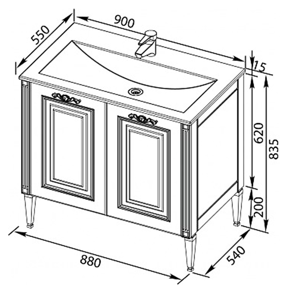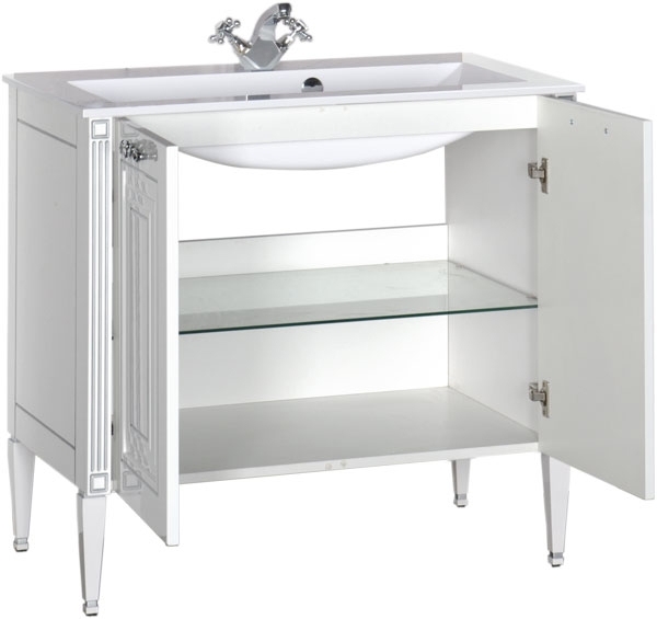 Тумба под раковину на ножках Aquanet Паола 90 181762 с двумя распашными дверцами и внутренней полкой из ударопрочного стекла. Классические формы в сочетании с передовыми технологиями. Фрезеровку и пилястры серебряного цвета дополняют изящные и устойчивые к воздействию влаги и истиранию ручки итальянского разработчика мебельной фурнитуры Sagittario. Благодаря механизму доводчиков дверцы закрываются бесшумно и легко. Тумба предназначена для использования в ванных комнатах с повышенной влажностью. Соответствует стандартам безопасности.