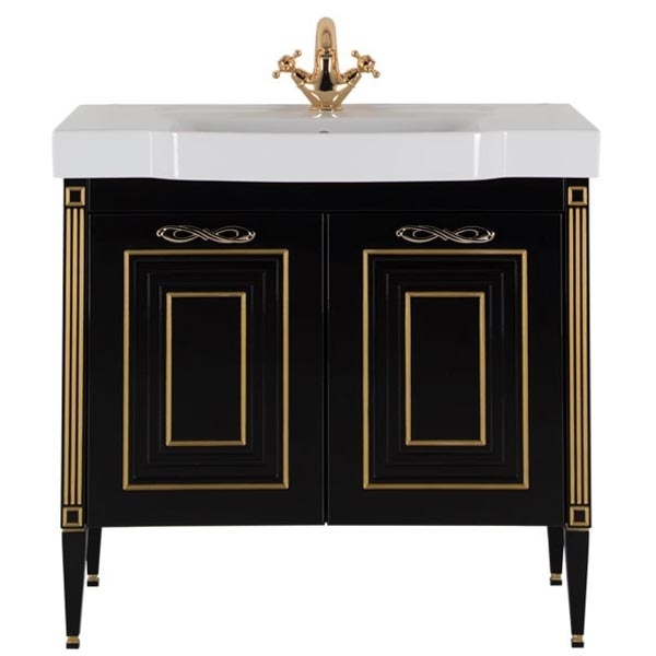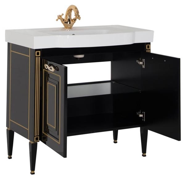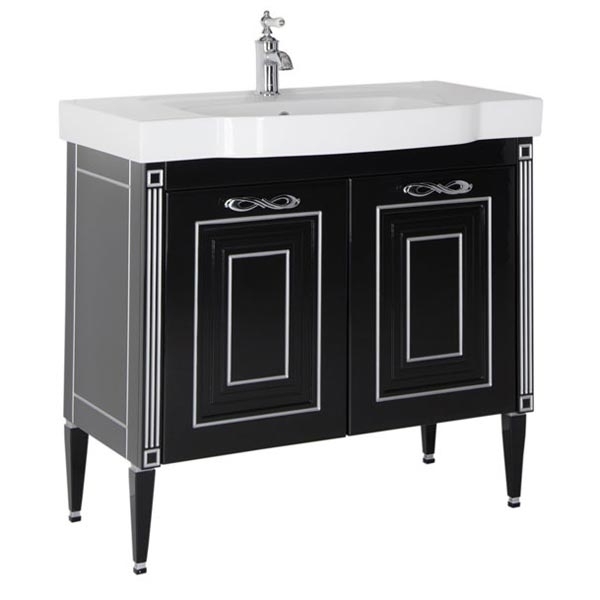 В составе комплектации тумба 90 см черного цвета с глянцевой поверхностью и патинированным серебряным декором.