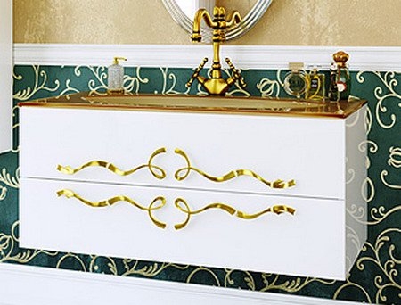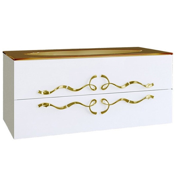 Подвесная тумба под раковину Aqwella Clarberg Due amanti 120 Due.01.Due.01.12/W/GL белаяглянцевая, с двумя выдвижными ящиками, с аккуратными и изящными золотыми ручками. Для использования в ванных комнатах с повышенной влажностью.