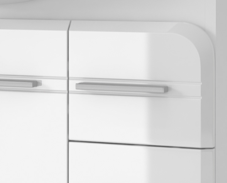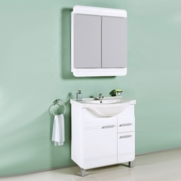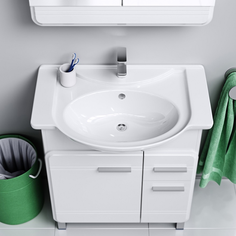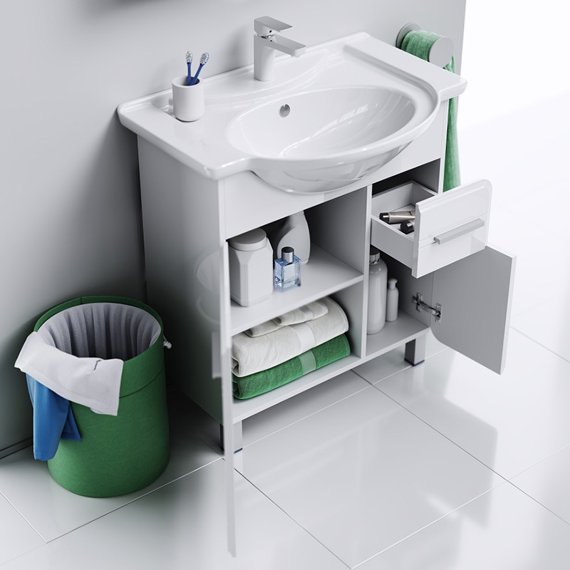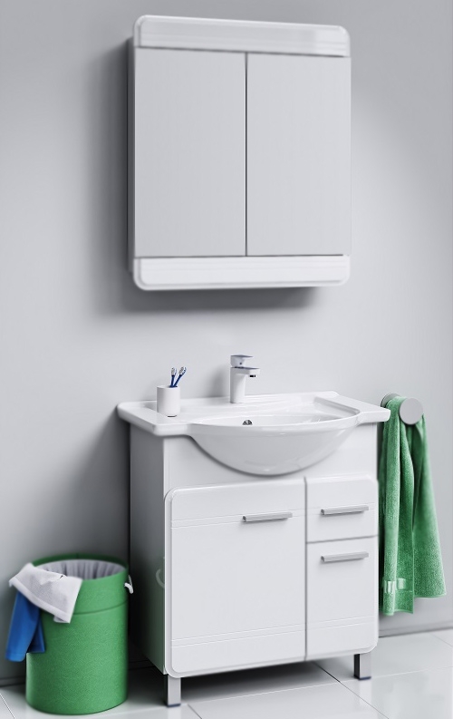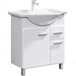 Тумба под раковину Aqwella Корсика 75 Т7м KOR0107 белая, с глянцевой поверхностью, с двумя ножками, с двумя распашными дверцами и одним выдвижным ящиком. Для использования в ванных комнатах с повышенной влажностью.