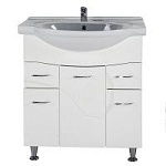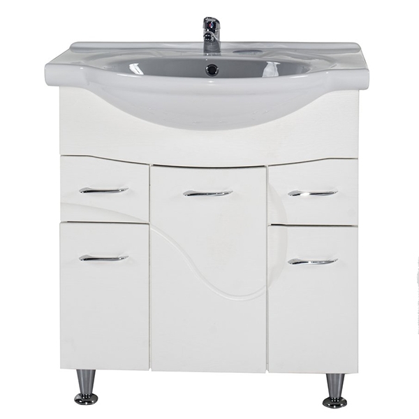 Тумба под раковину АСБ-мебель Альфа 75 10175 - напольная тумба с тремя распашными дверцами плавного закрывания и двумя выдвижными ящиками. Белая структурная пленка с фактурой дерева. Выполнена в современном стиле и дополнит большинство интерьеров ванных комнат. Предназначена для использования в ванных комнатах с повышенной влажностью.