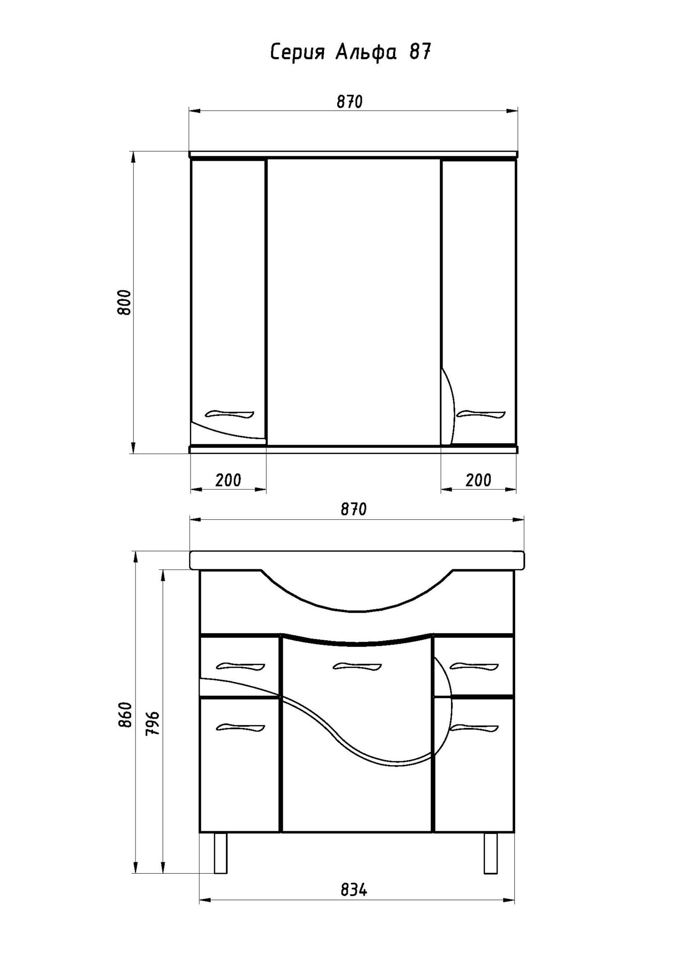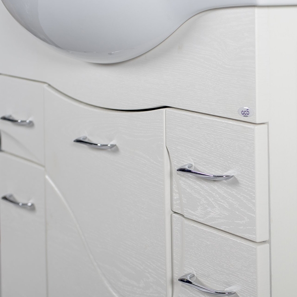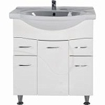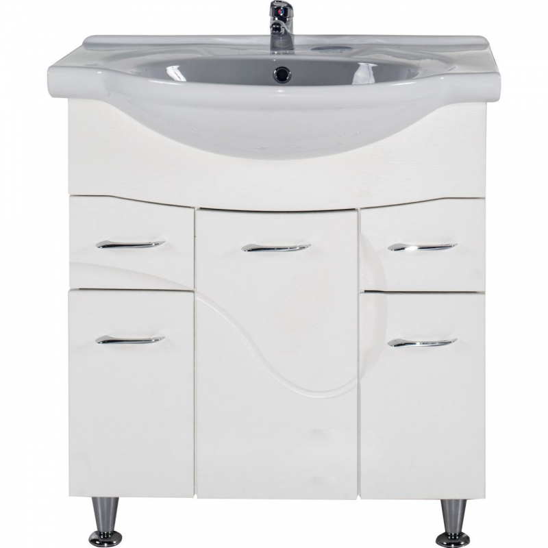 Тумба под раковину АСБ-мебель Альфа 87 10176 - напольная тумба с тремя распашными дверцами плавного закрывания и двумя выдвижными ящиками. Белая структурная пленка с фактурой дерева. Выполнена в современном стиле и дополнит большинство интерьеров ванных комнат. Предназначена для использования в ванных комнатах с повышенной влажностью.