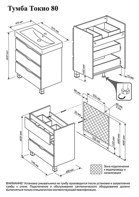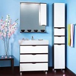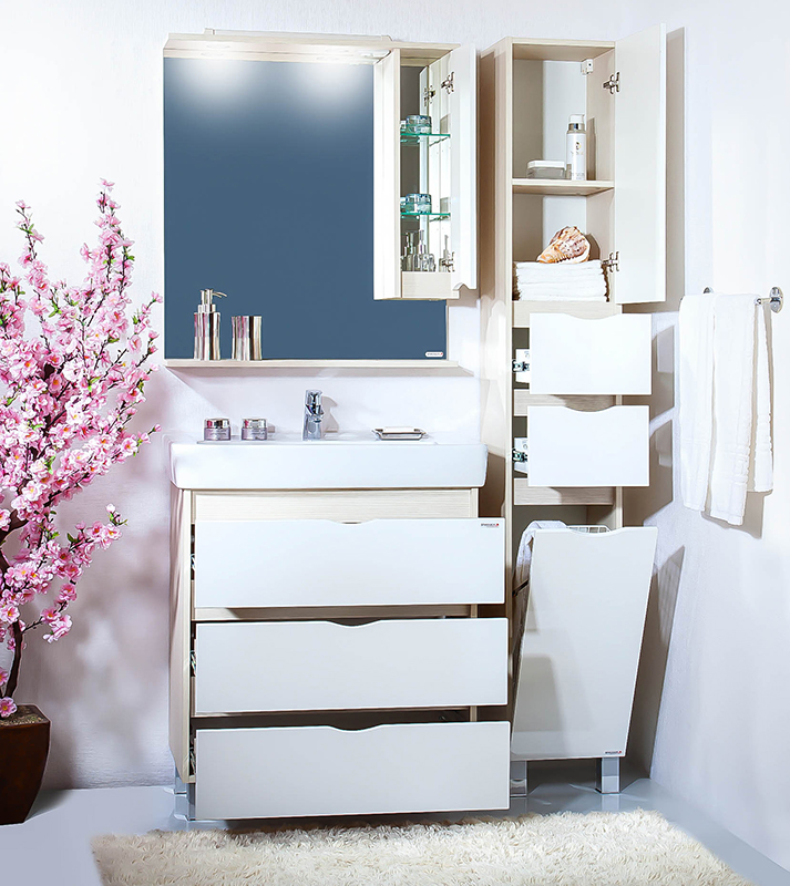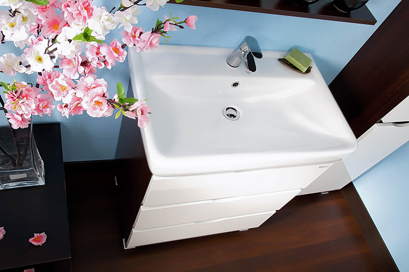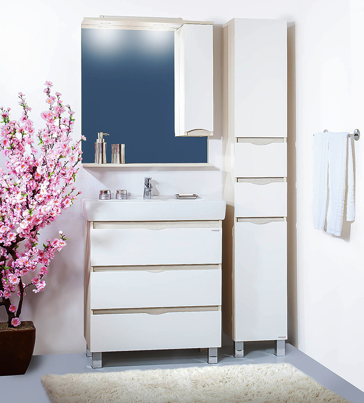 Тумба под раковину Бриклаер Токио 80 на ножках, с тремя выдвижными ящиками, с ручками в виде впадинок, олицетворяет собой японский минимализм. Корпус выполнен из ЛДСП в декоре цвета экзотического темного дерева, а фасад – из ПВХ с трехслойным покрытием белой глянцевой эмалью. Тумба проявляет устойчивость к влажному воздуху и длительное время сохраняет свой первоначальный внешний вид.