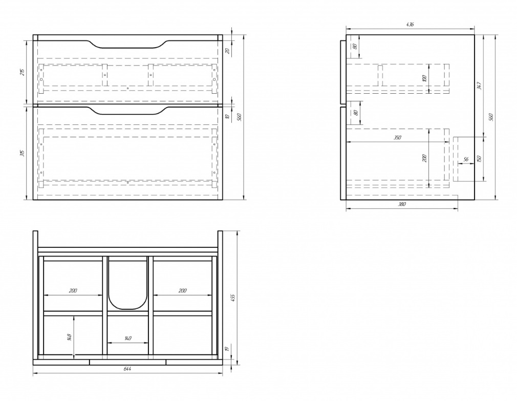 - Габариты корпуса тумбы: 64,4 х 56 х 45,5 см.