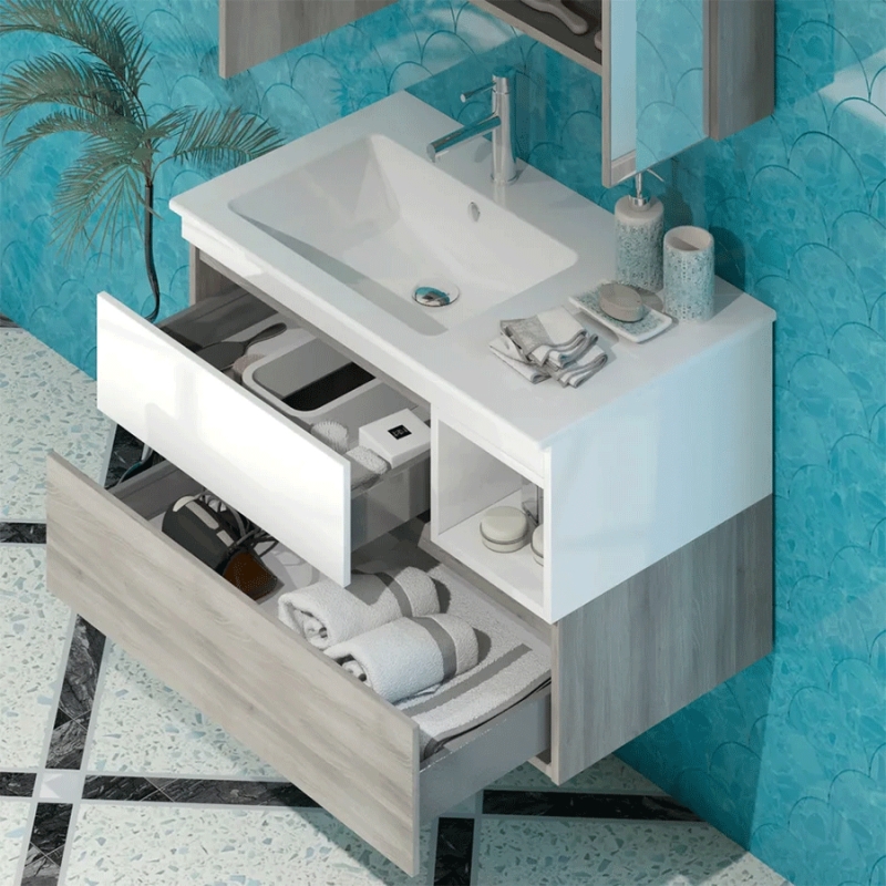 Подвесная тумба под раковину Opadiris Фортуна 90 Z0000015122 с двумя ящиками. Цвет: белый глянец, орегон.