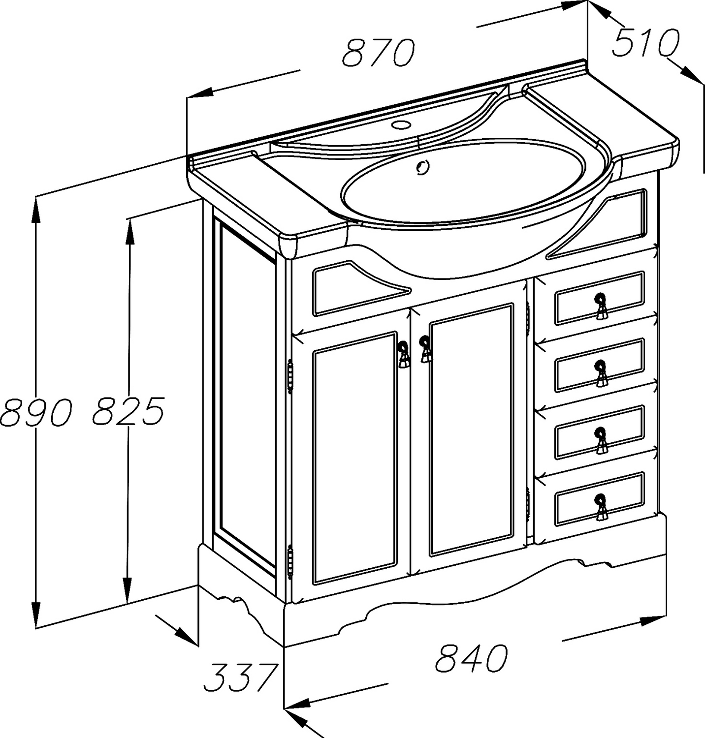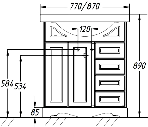 - Отделения: 2 распашные дверцы, 1 полка, 4 выдвижных ящика.