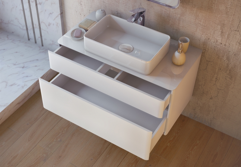 Подвесная тумба под раковину Raval Pure 100 Pur.01.100/P/W с гладкими формами, с двумя выдвижными ящиками со скрытым механизмом открывания Push to Open фирмы Hettich, со столешницей из стекла фирмы Lacobel. Предназначена для использования в ванных комнатах с повышенной влажностью. Влагостойкие и экологичные материалы, качественная работа фурнитуры, ударопрочность, приятные тактильные ощущения.