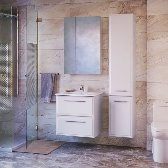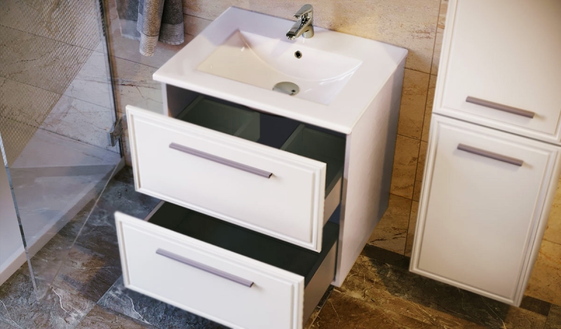Подвесная тумба под раковину Raval Quadro 60 Qua.01.60/P/W с двумя выдвижными ящиками. Предназначена для использования в ванных комнатах с повышенной влажностью. Ящики оснащены доводчиками с функцией плавного закрывания и разделителями для организации системы хранения. Влагостойкие и экологичные материалы, качественная работа фурнитуры, ударопрочность, приятные тактильные ощущения.