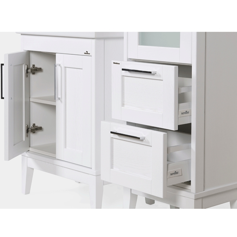 Фасад и корпус тумбы выполнены из массива ясеня, МДФ. Применяется многослойное покрытие эмалями лучших производителей, делающих мебель долговечной и экологичной.