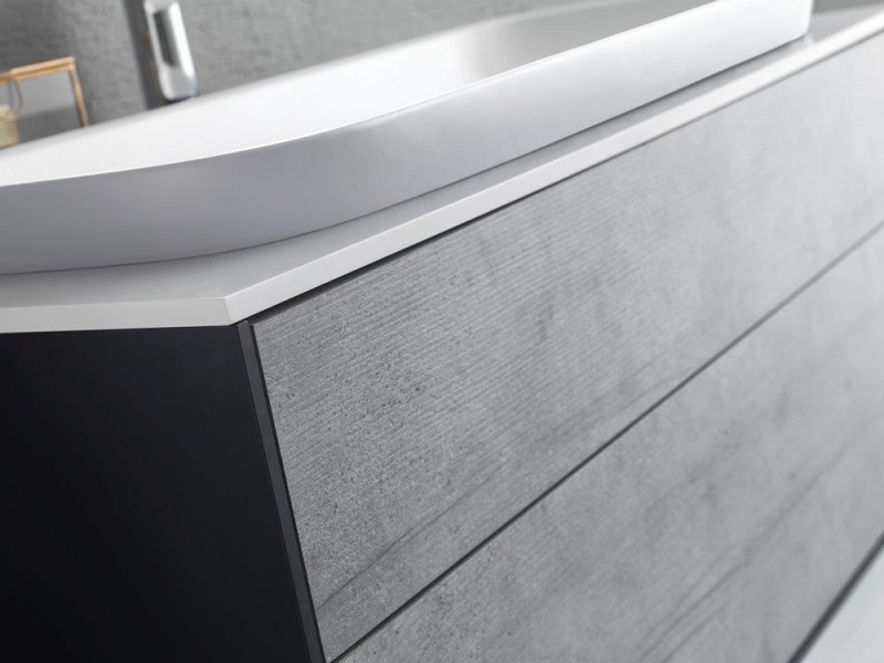 - Гладкая глянцевая поверхность боковых стенок изящно сочетается с фактурной поверхностью фасада, имитирующей текстуру бетона.