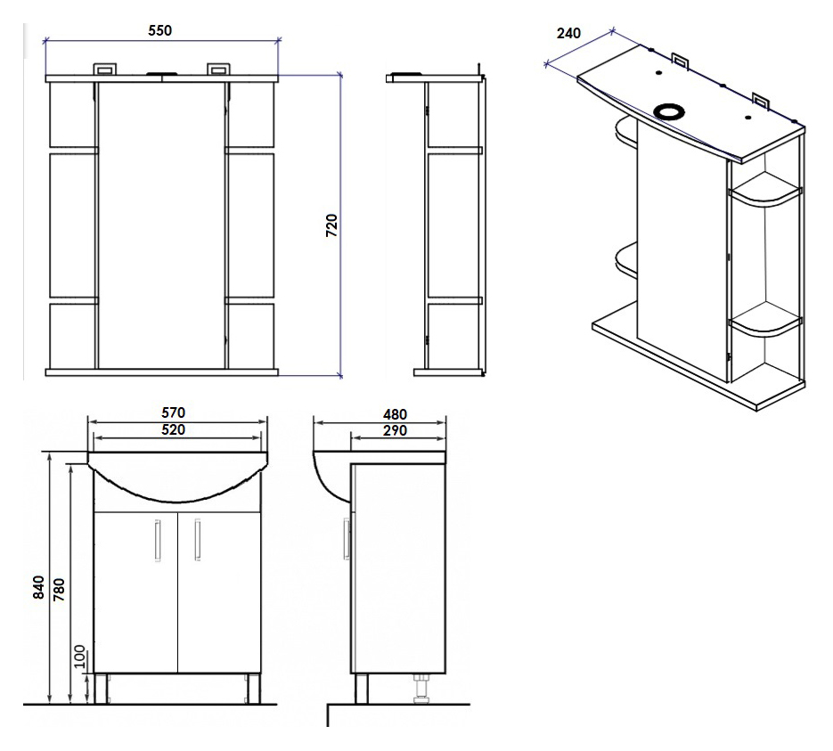 - Размеры тумбы с раковиной (ШхГхВ): 57x48x84 см.