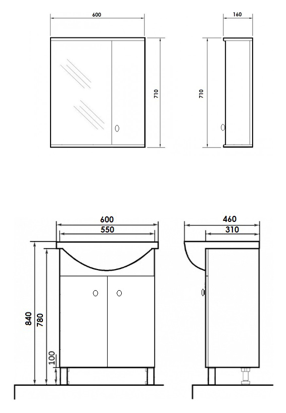 - Размеры тумбы с раковиной (ШхГхВ): 60x46x84 см.