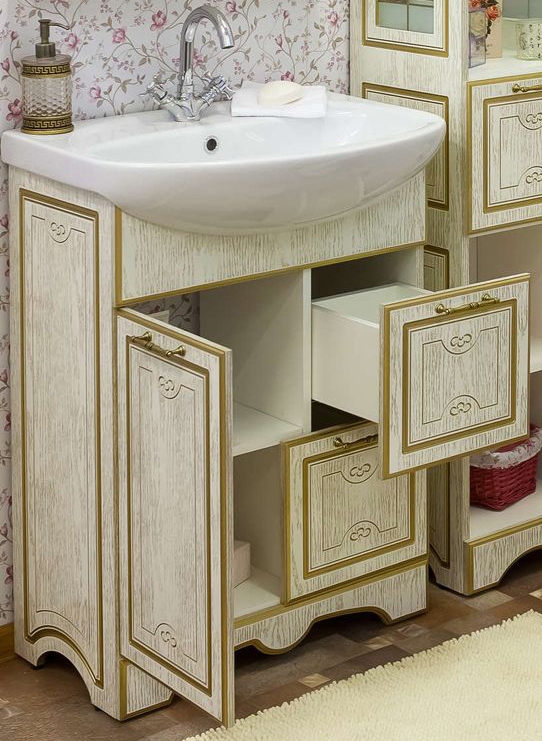 Напольная Тумба с раковиной Sanflor Адель 65 Н0000000554 белого цвета с золотым патинированием, с одной распашной дверцей и двумя выдвижными ящиками, для использования в ванных комнатах с повышенной влажностью.