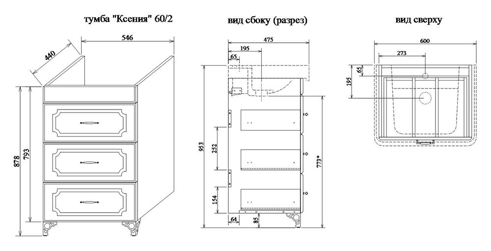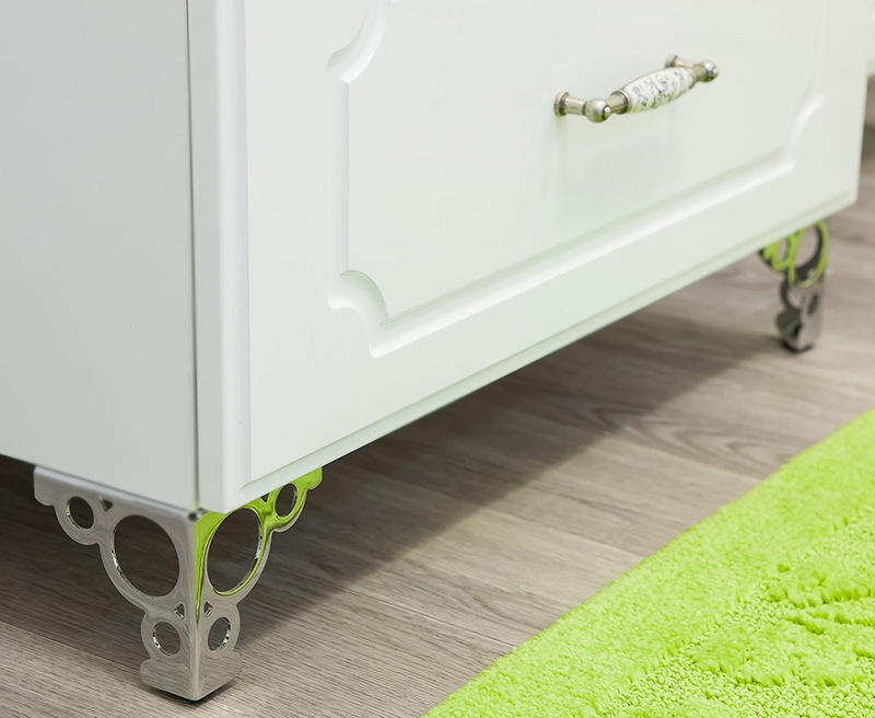 Тумба с раковиной Sanflor Ксения 60 2 Н0000000122 с фрезеровкой, с двумя фигурными ножками, с тремя выдвижными ящиками, для использования в ванных комнатах с повышенной влажностью.