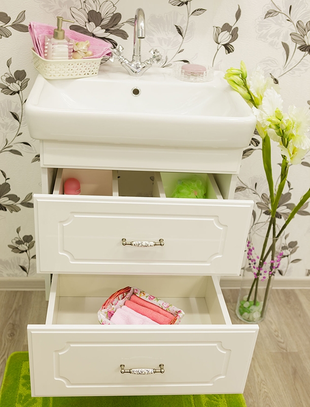 Подвесная Тумба с раковиной Sanflor Ксения 60 Н0000000127 с фрезеровкой, с двумя выдвижными ящиками, для использования в ванных комнатах с повышенной влажностью.
