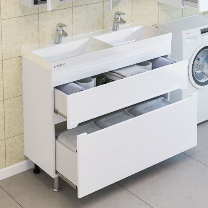 Тумба оснащена механизмами плавного и бесшумного закрытия, направляющими скрытого монтажа.