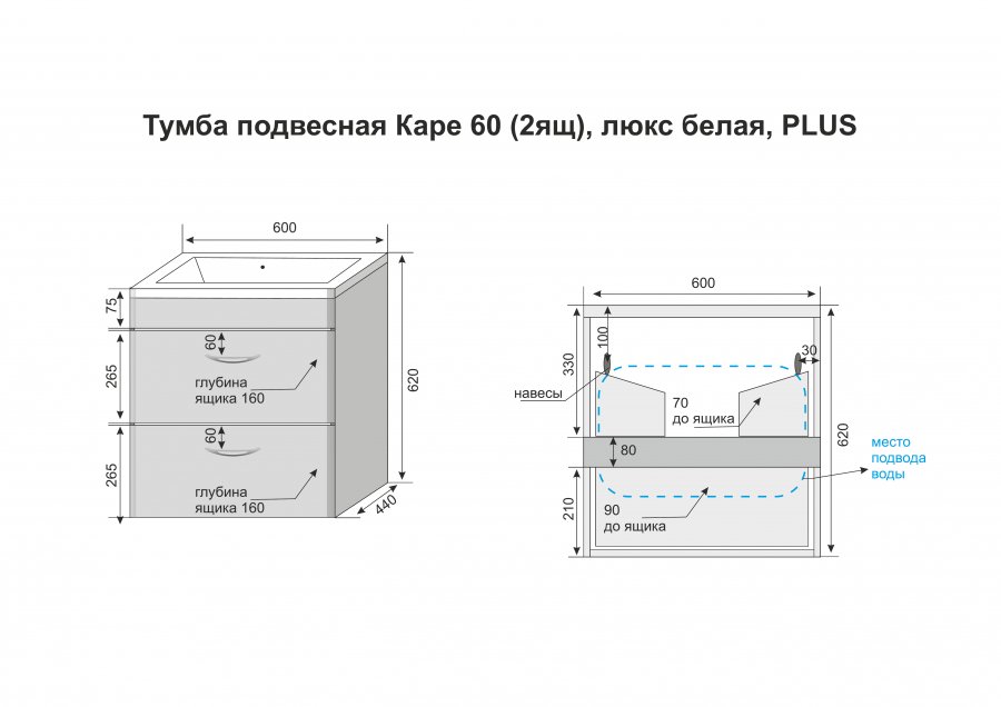 - Габариты корпуса тумбы (ШхВхГ): 60 х 62 х 44 см.