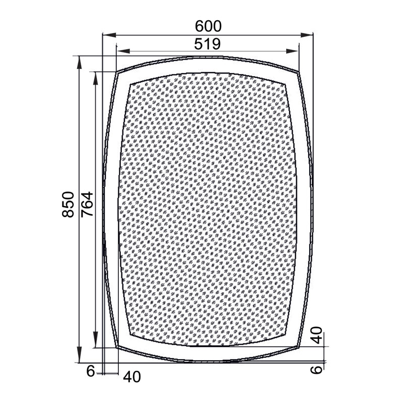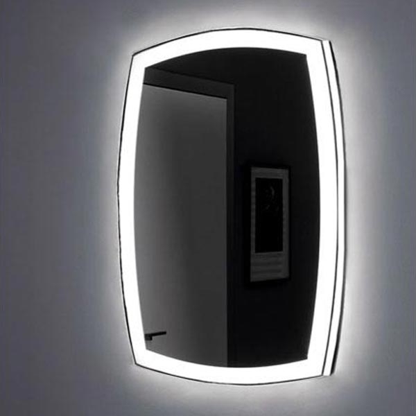 Зеркало имеет форму прямоугольника с изогнутыми сторонами.
