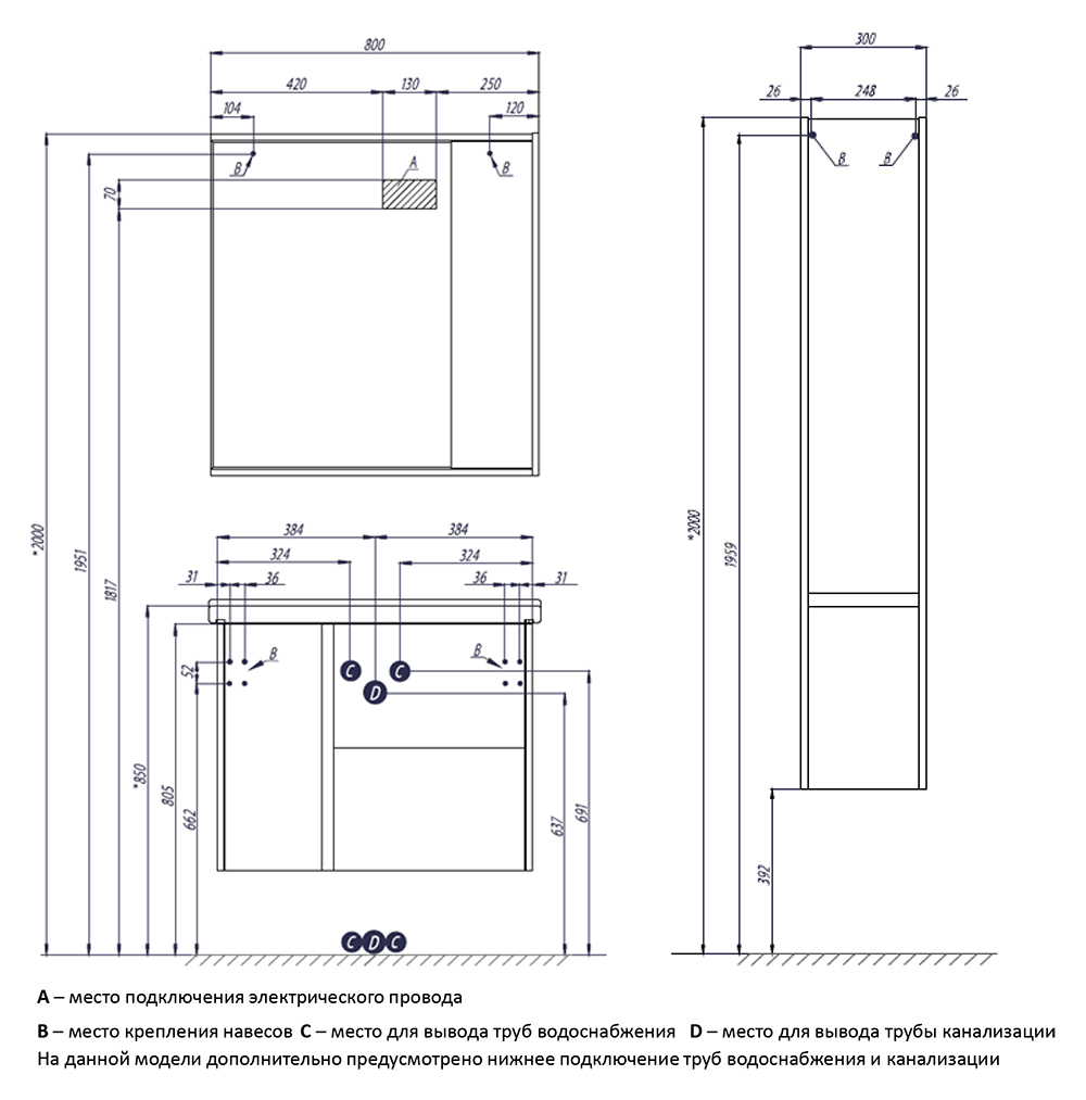 - Полка снизу: открытая, фиксированная.