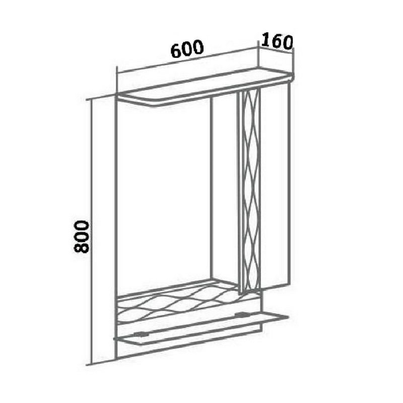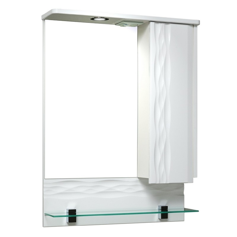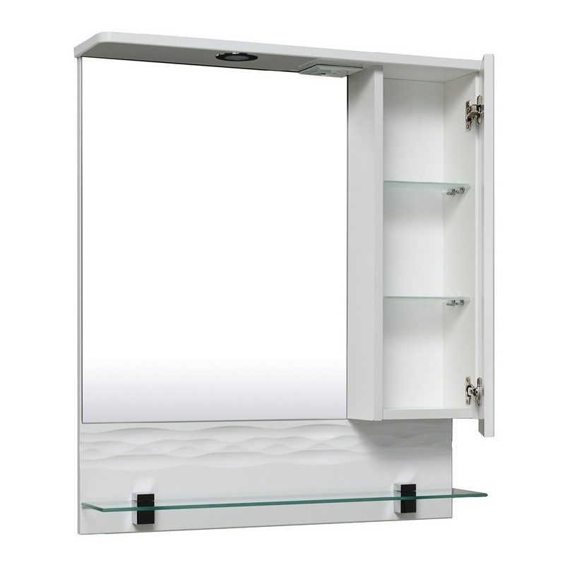 Зеркало со шкафом Runo Вега оборудовано одним врезным светодиодным светильником 220В и розеткой с выключателем. Справа - шкафчик с распашным фасадом, за которым две стеклянные полки. Под шкафом - стеклянная полка, закрепленная на 2-х Хромированных полкодержателях. Петли со встроенным доводчиком. Характеристики: