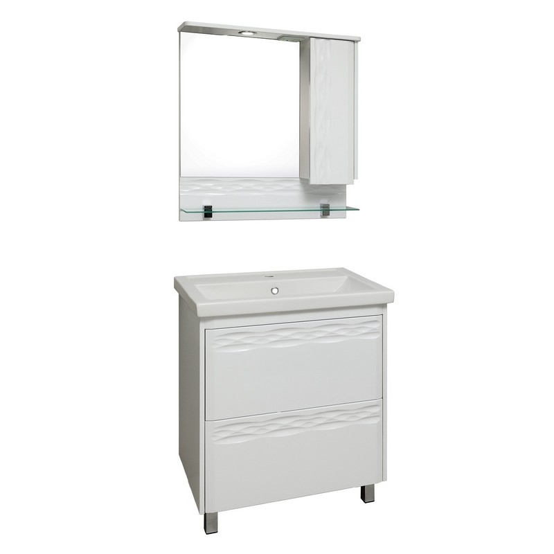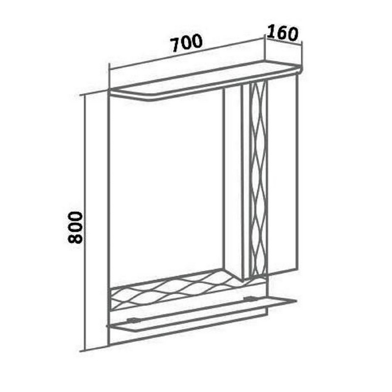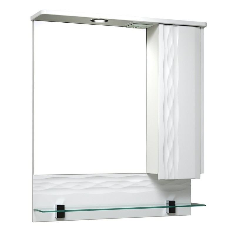 Зеркало со шкафом Runo Вега оборудовано одним врезным светодиодным светильником 220В и розеткой с выключателем. Справа - шкафчик с распашным фасадом, за которым две стеклянные полки. Под шкафом - стеклянная полка, закрепленная на 2-х Хромированных полкодержателях. Петли со встроенным доводчиком. Характеристики: