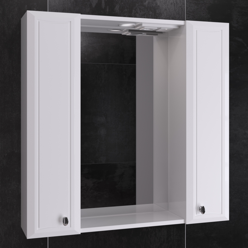 В комплекте поставки: Зеркало со шкафом, две полки, светильник, выключатель, розетка.