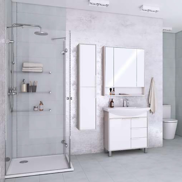 Белоснежный цвет фасадов в сочетании со вставками и боковыми стенками Ясень фабрик придадут вашей ванной комнате ощущения свежести и уюта. Благодаря лаконичным белым ручкам на тумбе и отсутствию лицевой фурнитуры на шкафчике коллекция универсальна, впишется в любую ванную комнату.