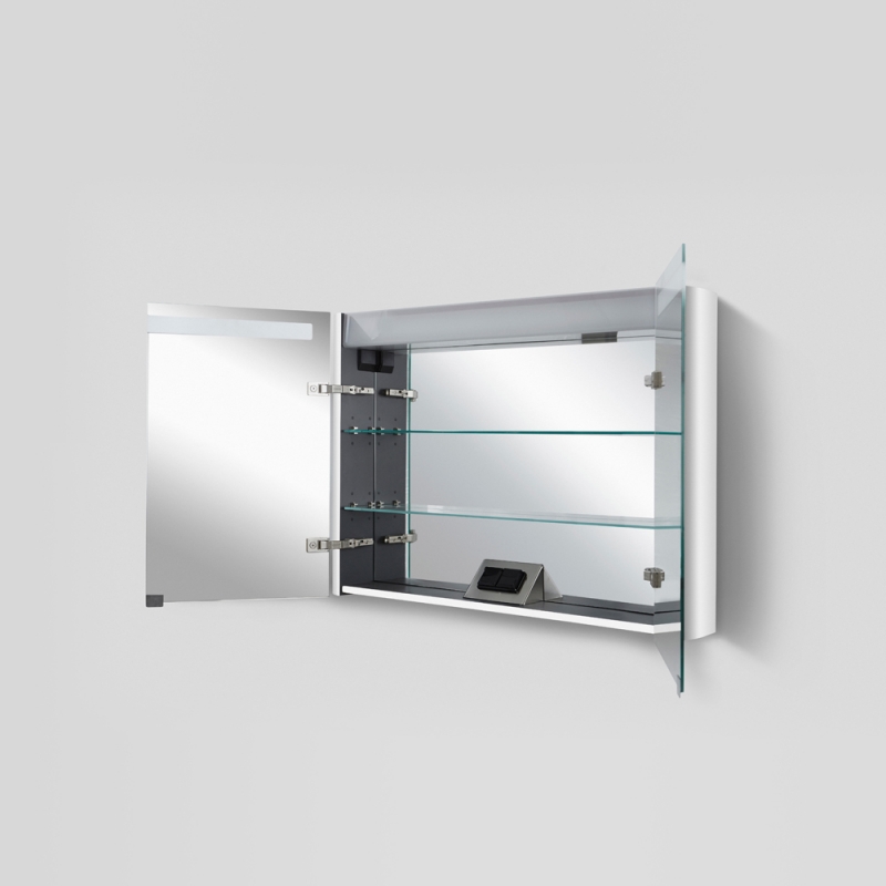 Зеркальный шкаф в ванную AM.PM Sensation 100 M30MCX1001WG с двумя распашными дверцами и двумя полками за ними, с подсветкой сверху, с розеткой и выключателем.