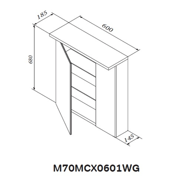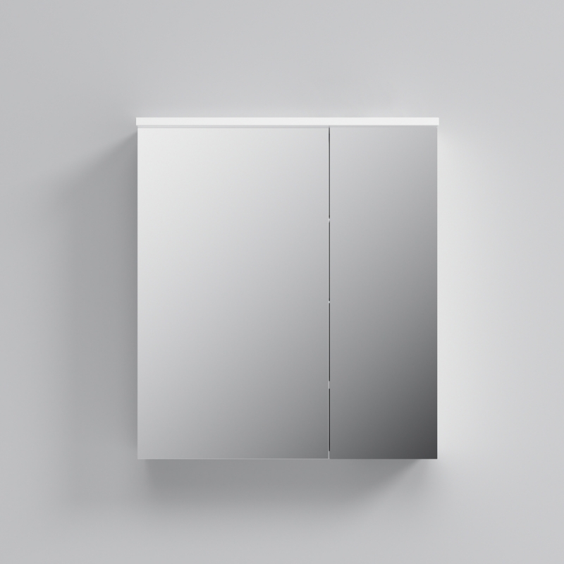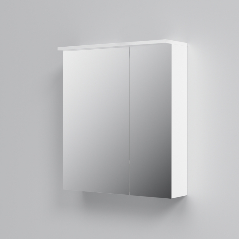 Зеркальный шкаф AM.PM Spirit 60 M70MCX0601WG с двумя распашными дверцами и двумя полками за ними, с подсветкой сверху, с выключателем и розеткой. Для использования в ванных комнатах с повышенной влажностью.