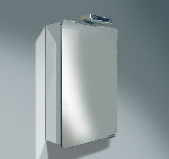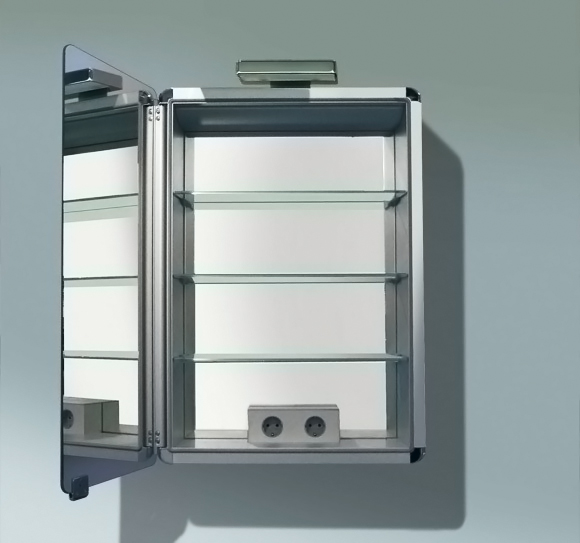 Зеркальный шкаф Keuco Elegance 21601 171201 из серебристого анодированного алюминия, петли слева. 1 распашная дверца из хрустального стекла, с двух сторон зеркальная, боковины корпуса зеркальные, задняя стенка зеркальная, галогенная подсветка (2 x 20 Вт), 1 внешний выключатель на корпусе, 2 электрические розетки внутри, 3 стеклянные полочки, регулируемые по высоте. В комплект поставки входит зеркальный шкаф.