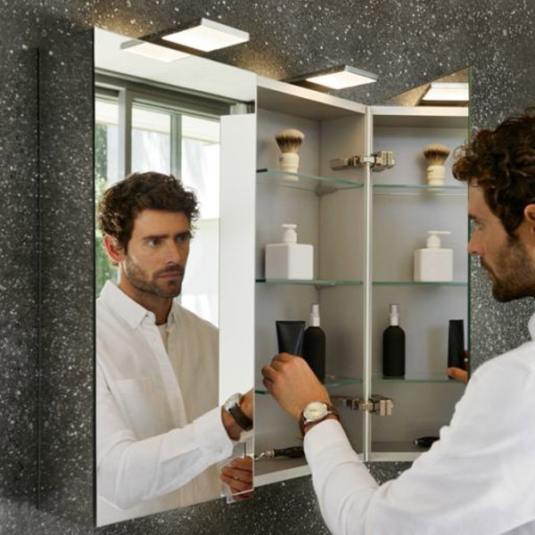 - Трехрежимная яркость освещения регулируется с помощью интуитивно простого управления переключателем, расположенного под корпусом зеркального шкафа.