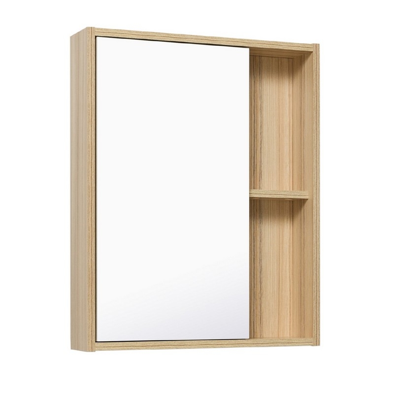 Зеркальный шкаф Runo Эко с одной распашной дверкой и открытыми полками (слева или справа, зависит от установки). Внутри шкафа две внутренние полки. Универсальный. Шкаф можно доукомплектовать светодиодным светильником LED FERUS IP44, 220V, который крепится на торец. Светильник в комплект не входит, приобретается отдельно.Характеристики: