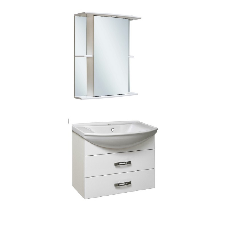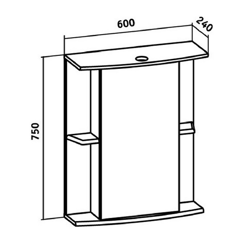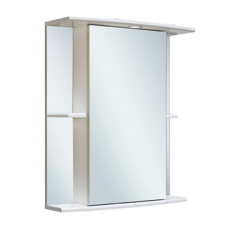 Зеркальный шкаф Runo Мадрид оборудован одним врезным светодиодным светильником 220В и розеткой с выключателем. По центру - шкаф с зеркальной дверцей и двумя внутренними полками, справа и слева -по одной открытой полочке. Петли со встроенным доводчиком.Характеристики:
