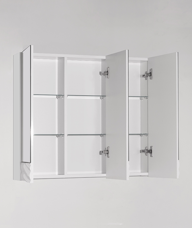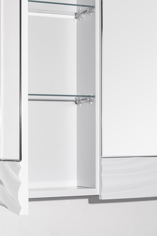 Подвесной зеркальный шкаф Style Line Вероника 80 ЛС-00000057 с оригинальной 3D фрезеровкой фасада и доводчиками Hettich. Кромка зеркала зашлифована и защищает от порезов. Стеклянные полки с еврокромкой и прозрачными полкодержателями Hefele. Лазерная гравировка фирменного логотипа.