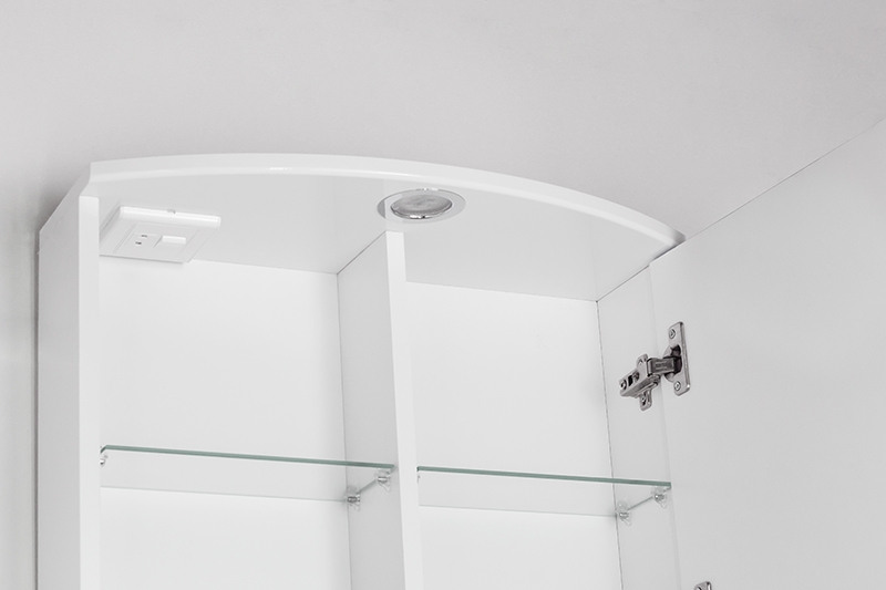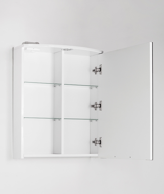 - оснащение: зеркало с подсветкой (встроенный светильник с выключателем, трансформатор, розетка), механизм доводчика для плавного бесшумного закрывания дверцы