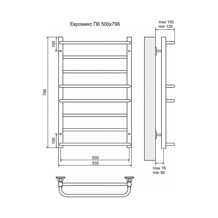 Электрический полотенцесушитель Terminus Евромикс П8 500x796 4660059920733, ТЭН HT-1 300W, левый/правый. Для производства полотенцесушителя используется только высококачественная нержавеющая сталь марки AISI 304L с высоким содержанием легирующих элементов, Ni и Cr, это позволяет изделиям сохранять стойкость к агрессивным коррозийным средам, что существенно продлевает срок их эксплуатации.
