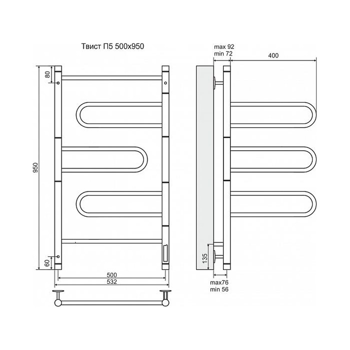 Электрический полотенцесушитель Terminus Твист П5 500x950 4660059580227 поворотный Хром