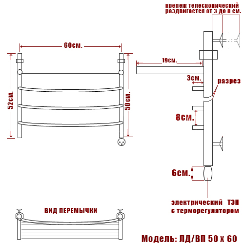 - Выступ полки на 19 см и перекладин на 3 см от основной трубы.