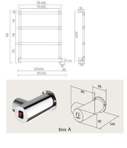 Электрический полотенцесушитель Margaroli 5423706CRNB, на четыре секции, Диаметр латунной трубы - Ø25 мм. Скрытый монтаж включения/выключения (BOX). Расстояние между подсоединениями: 370 мм. Расстояние от стены: 105 мм
