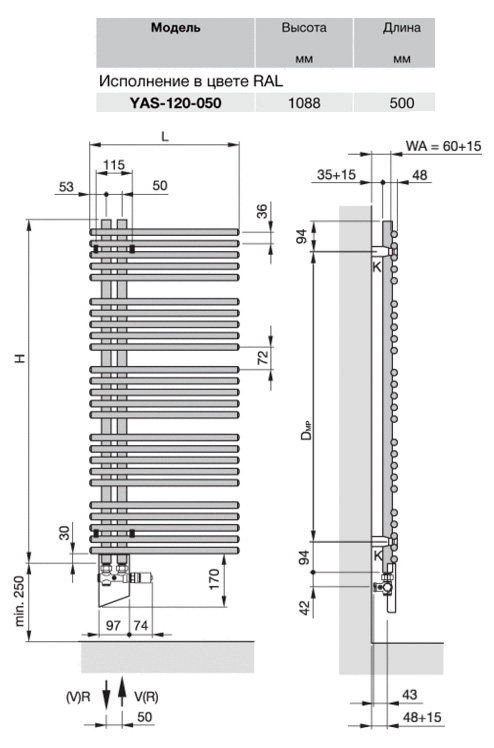 Водяной полотенцесушитель Zehnder Yucca Star YAS-120-050 покрытый эмалью Ral 9016. Цвет - белый. Поставляется в комплекте с креплениями в цвет полотенцесушителя.