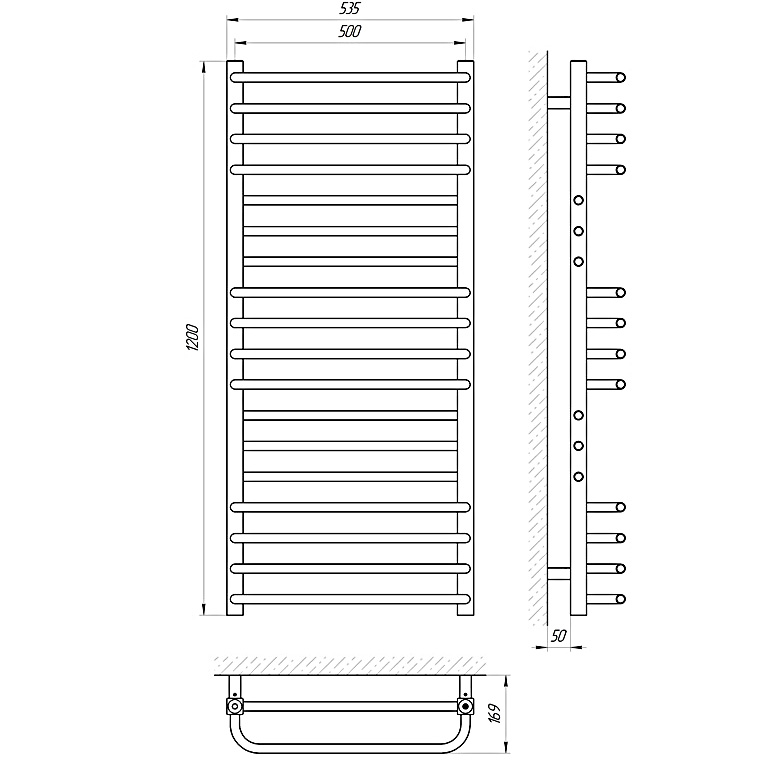 Группировка перекладин 4-3-4-3-4. Все элементы полотенцесушителя выполнены из нержавеющей стали.