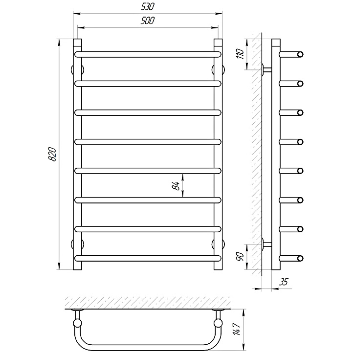 Группировка перекладин 8. Все элементы полотенцесушителя выполнены из нержавеющей стали.