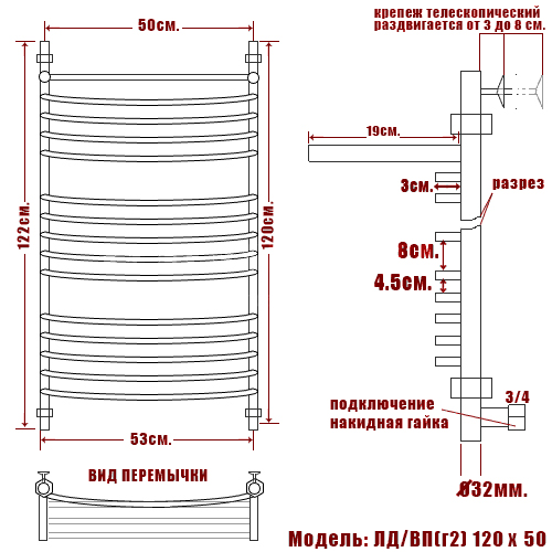 - Наружный диаметр основной трубы/перекладин: 32/18 мм.