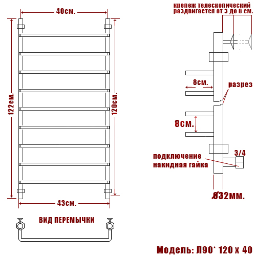 - Наружный диаметр основной трубы/перекладин: 32 / 18 мм.