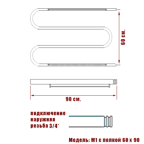 Водяной полотенцесушитель Ника Simple М1/СП 3/4 60x90 см с полкой, цвет хром.
